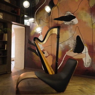 Las paredes revestidas con paneles de madera y luces LED integradas, crean una atmósfera dinámica y envolvente. Los muebles son una mezcla de formas geométricas y curvas suaves, con acabados en cromo y materiales sintéticos que recuerdan a los años 60 y 70, pero con un toque visionario. El ambiente se completa con una colección de viniles y casetes antiguos, albergados en un librero de melamina en combinación con piezas de iluminación y decorativas de gran impacto visual.